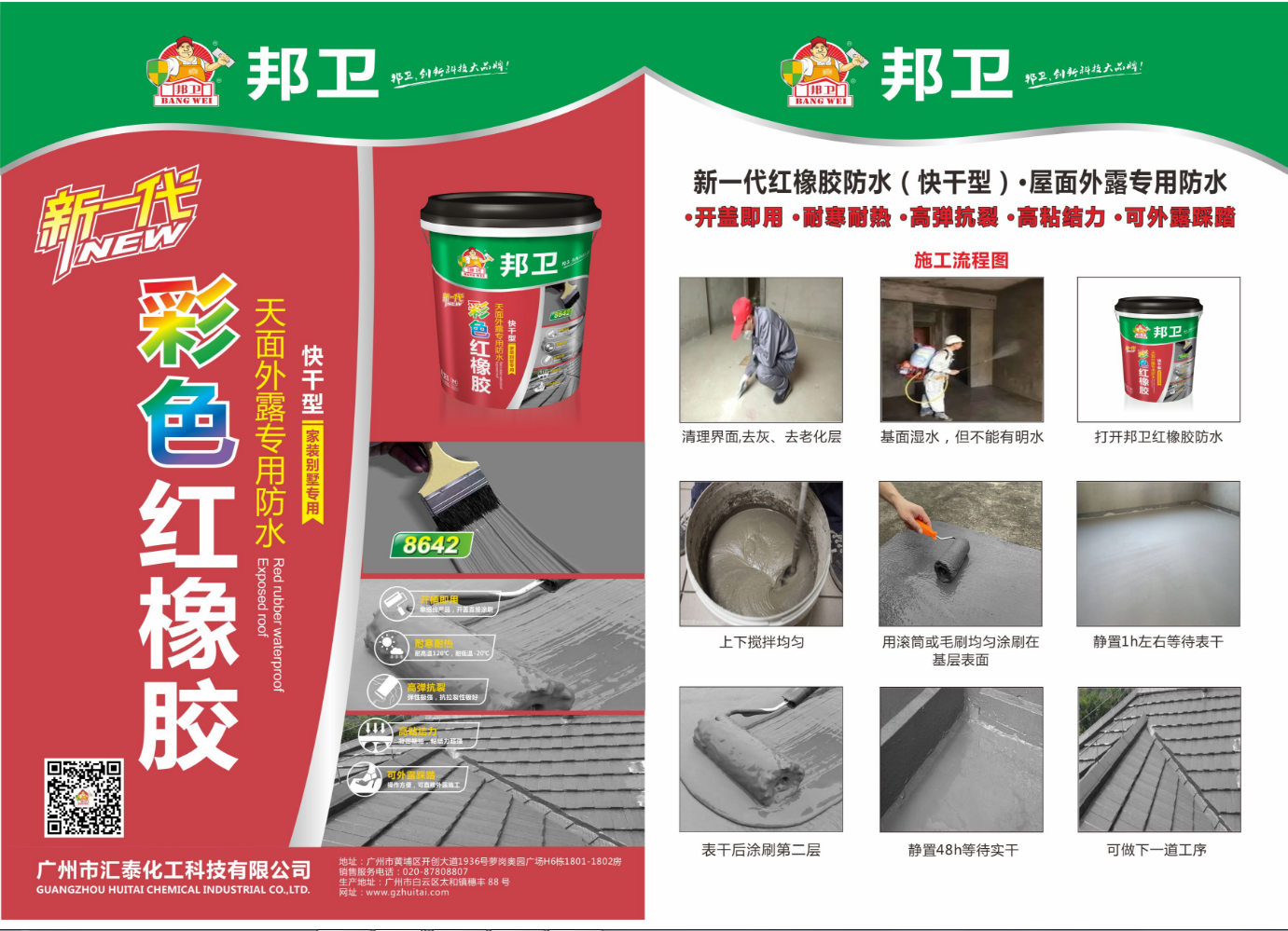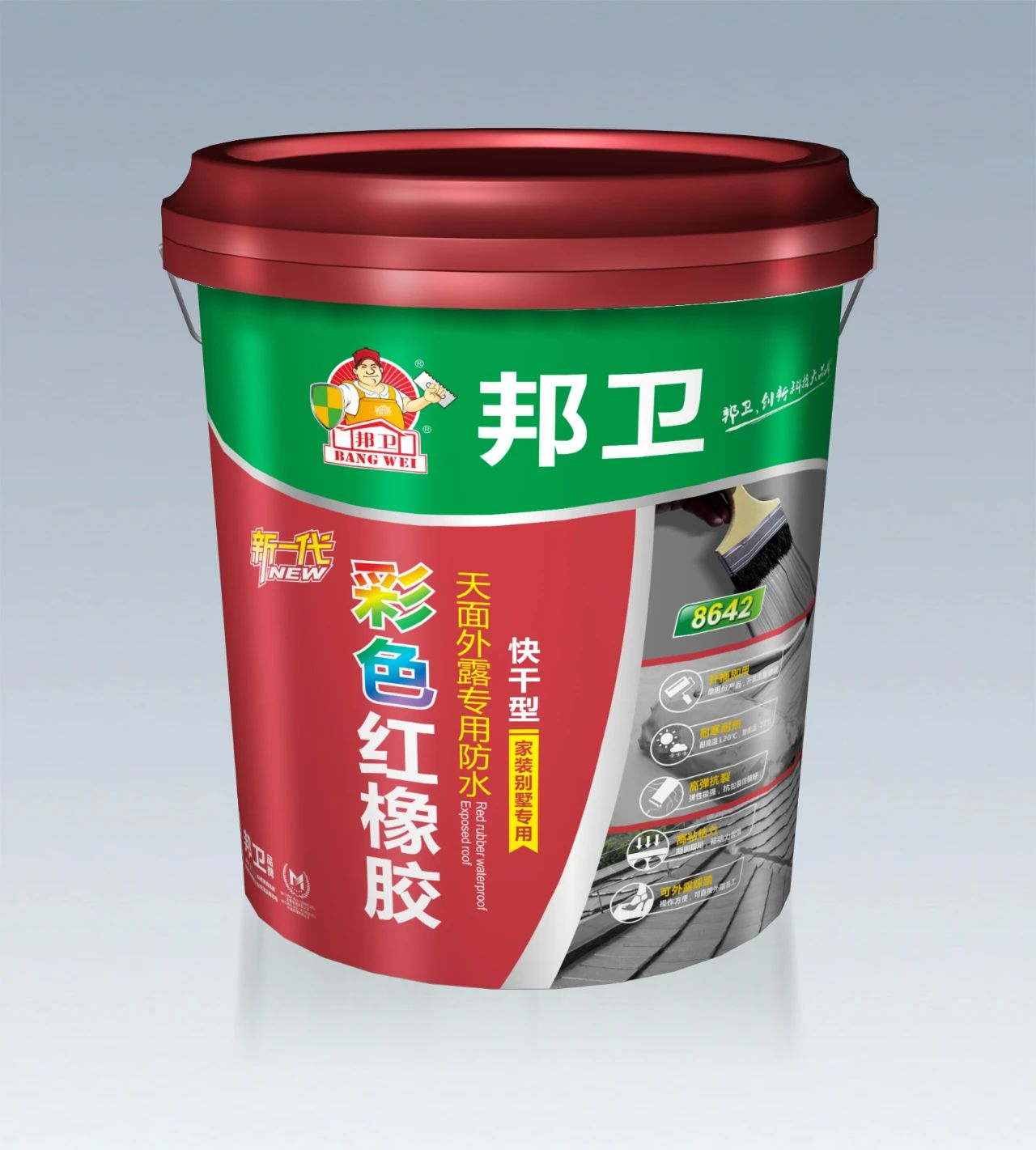 邦衛(wèi)新一代紅橡膠屋面外露專用防水涂料是由本公司經(jīng)過長期研究家裝別墅等高級防水需求,并結(jié)合環(huán)保性前提,對橡膠類產(chǎn)品的彈性特性特點采用特殊工藝,改良出新一代橡膠特性的水性屋面外露專用防水;該產(chǎn)品經(jīng)過調(diào)整創(chuàng)新后應(yīng)用于家裝別墅專用和高級屋面外露防水專用;產(chǎn)品開蓋后可以直涂于各種材面屋面,涂刷混凝土屋面可做外露型防水,涂刷金屬屋面可做隔熱防銹作用;涂刷后經(jīng)固化成為橡膠狀防水層,形成高粘結(jié)性和高強彈力的防水涂膜,具備有機材料彈性好與無機材料耐久性好之雙重優(yōu)點,可抵御基層適度裂紋修復(fù)和適度位移抗裂處理。